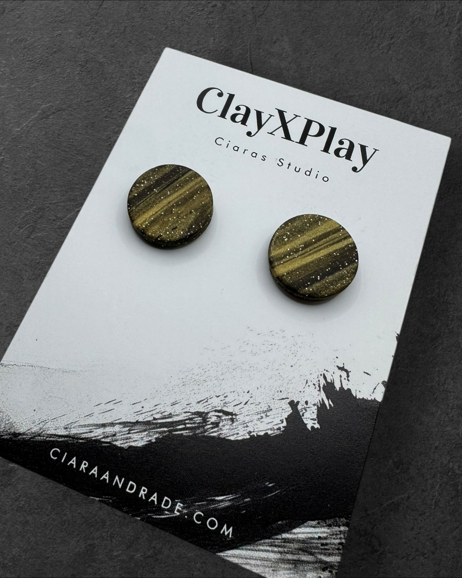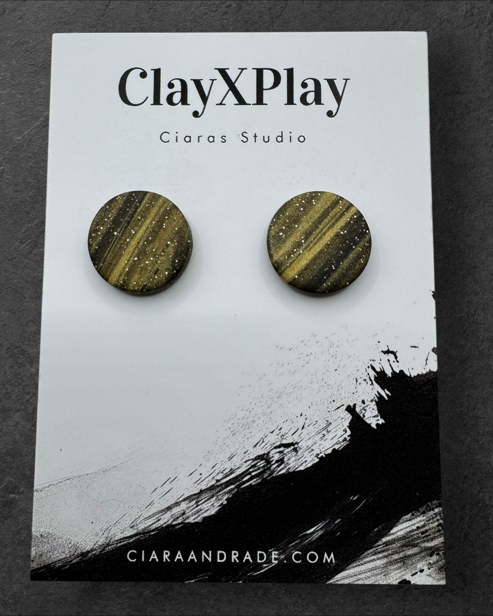 Gold & Black Striped Glitter Medium Polymer Clay Round Stud Earrings