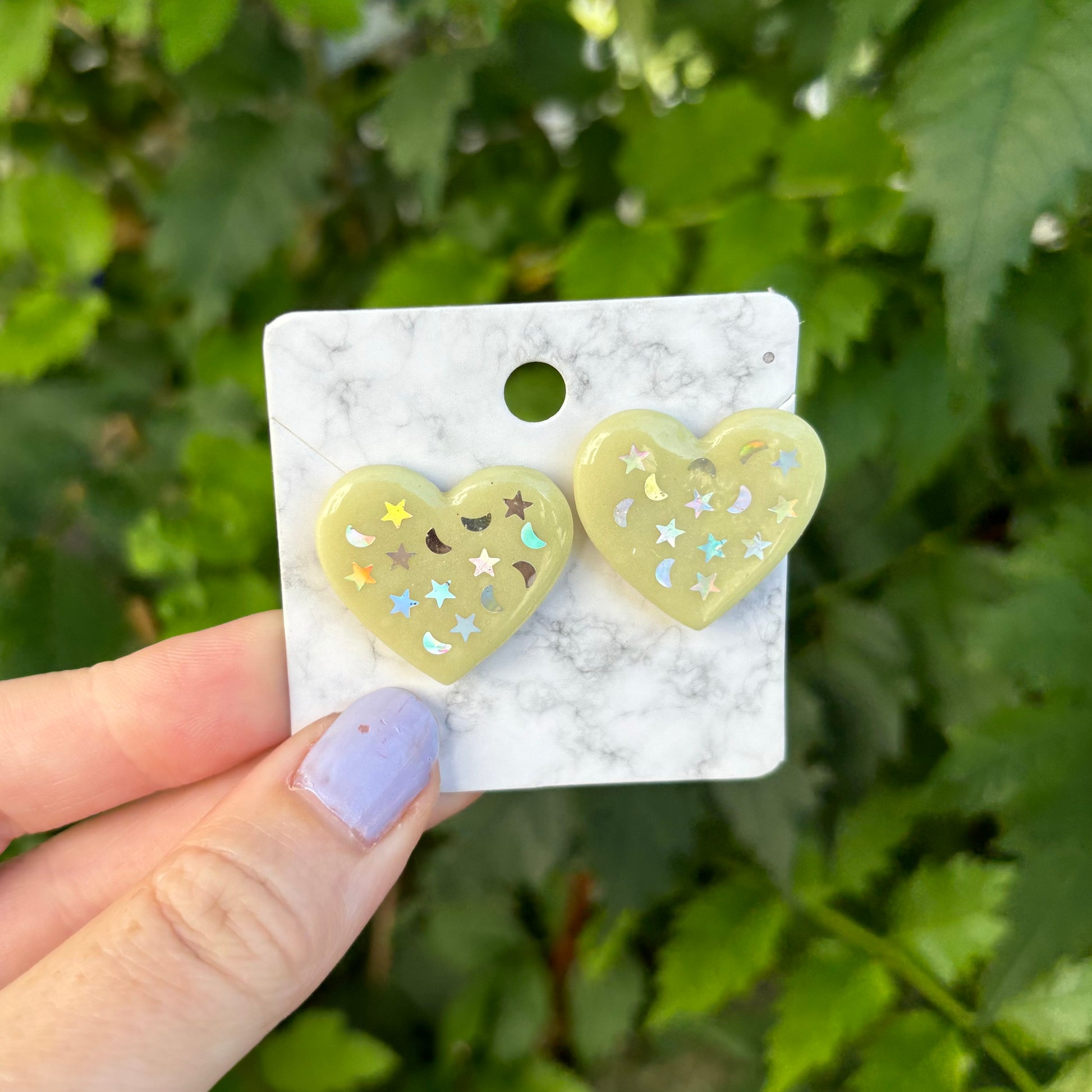 Starry Night Heart Yellow Polymer XL Clay Stud Earrings