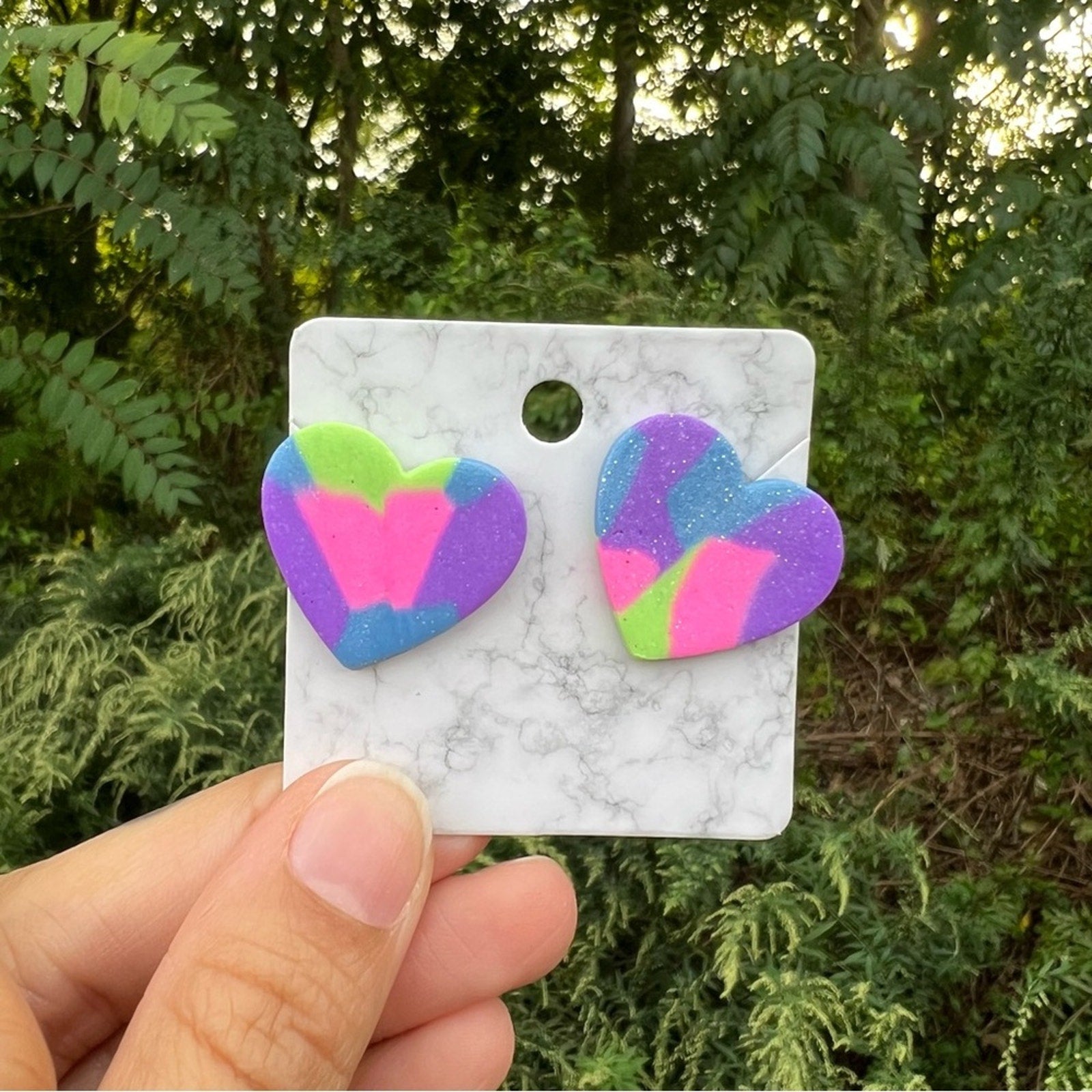 Multi Color Purple Green Blue XL Heart Clay Stud Earrings Handmade Handcrafted