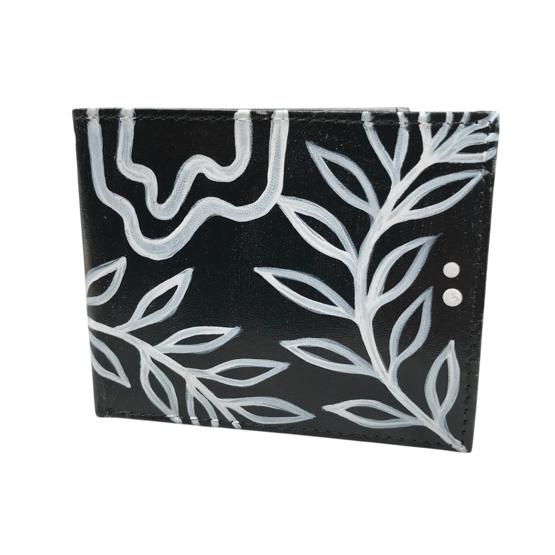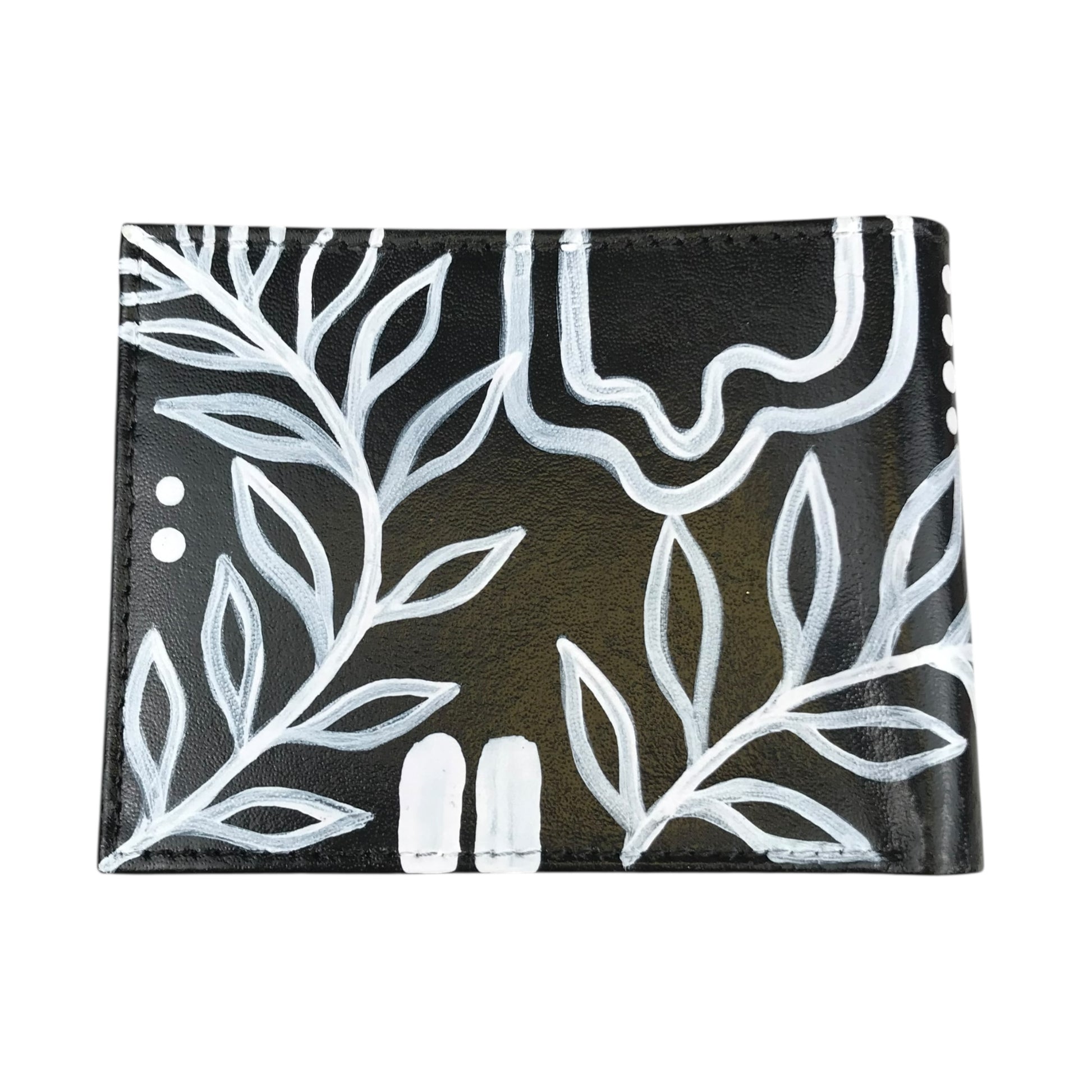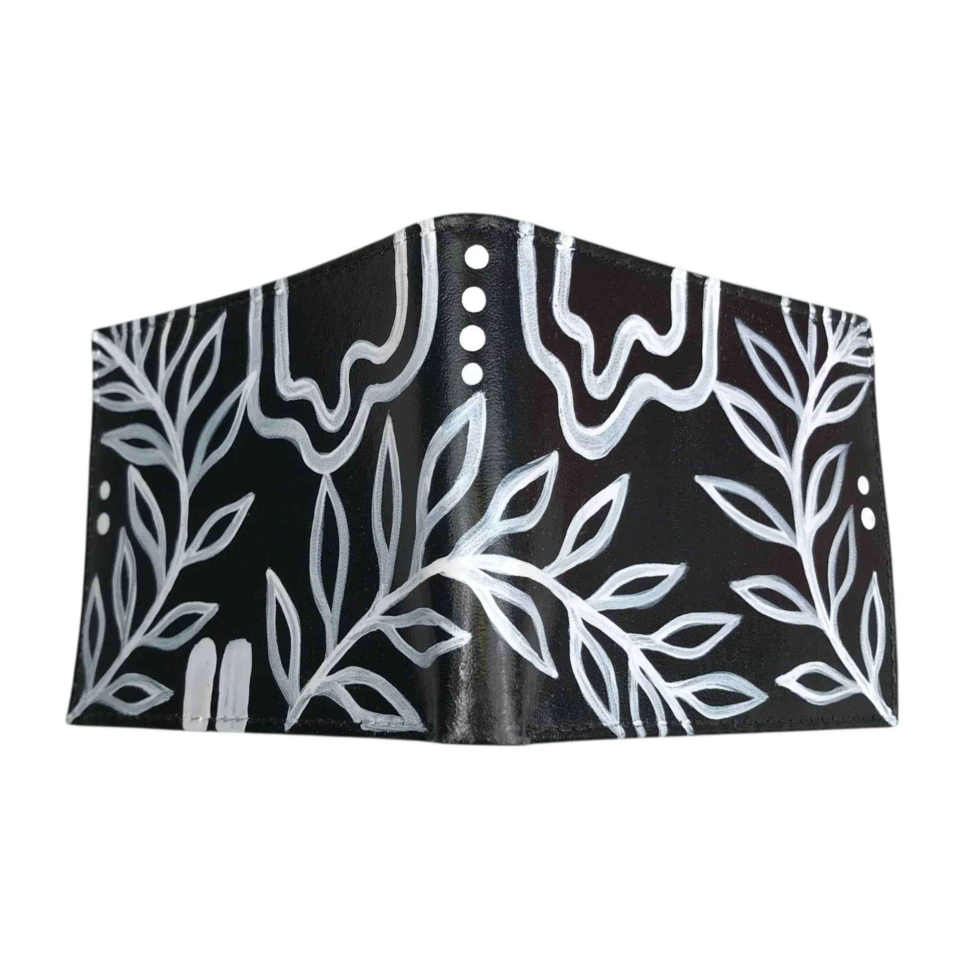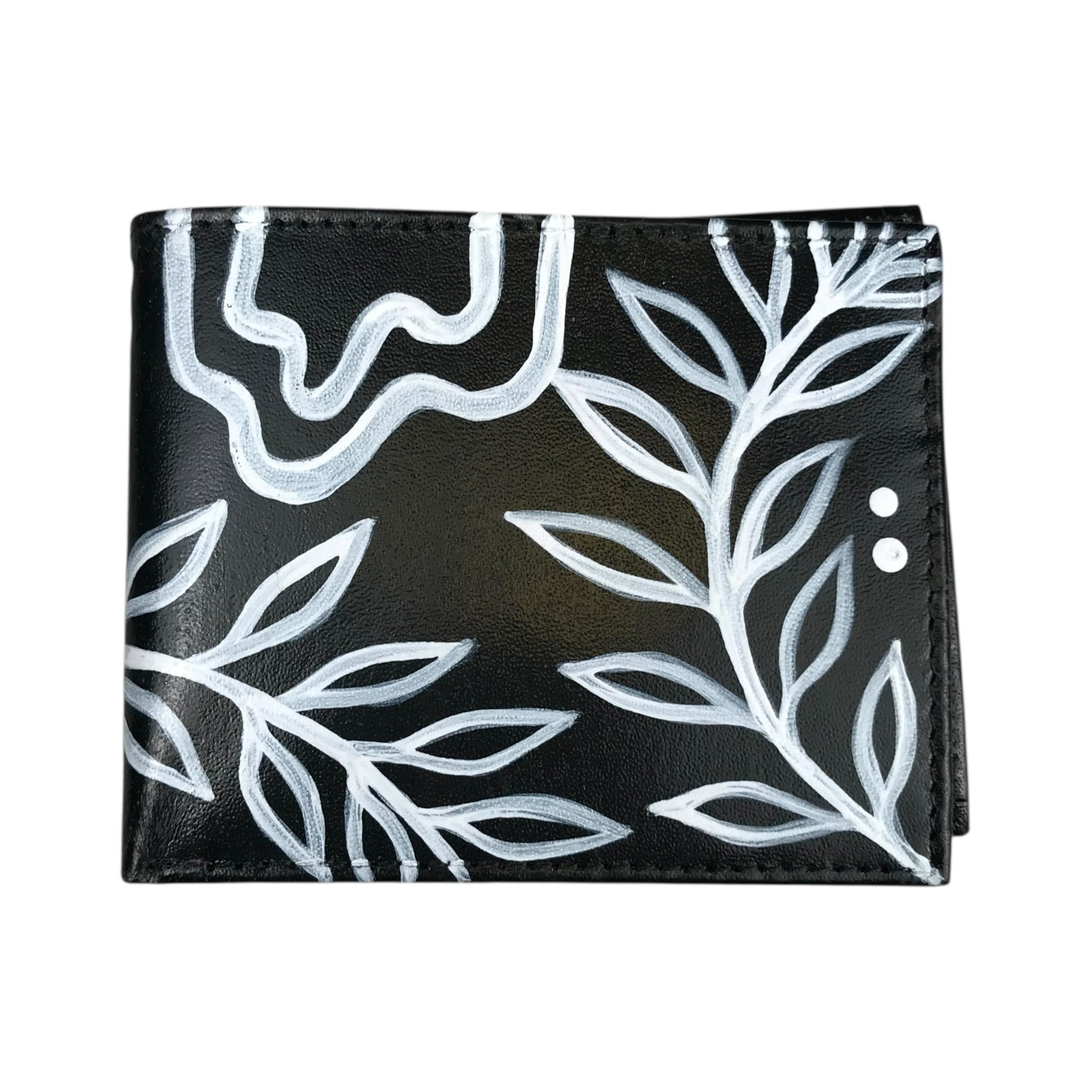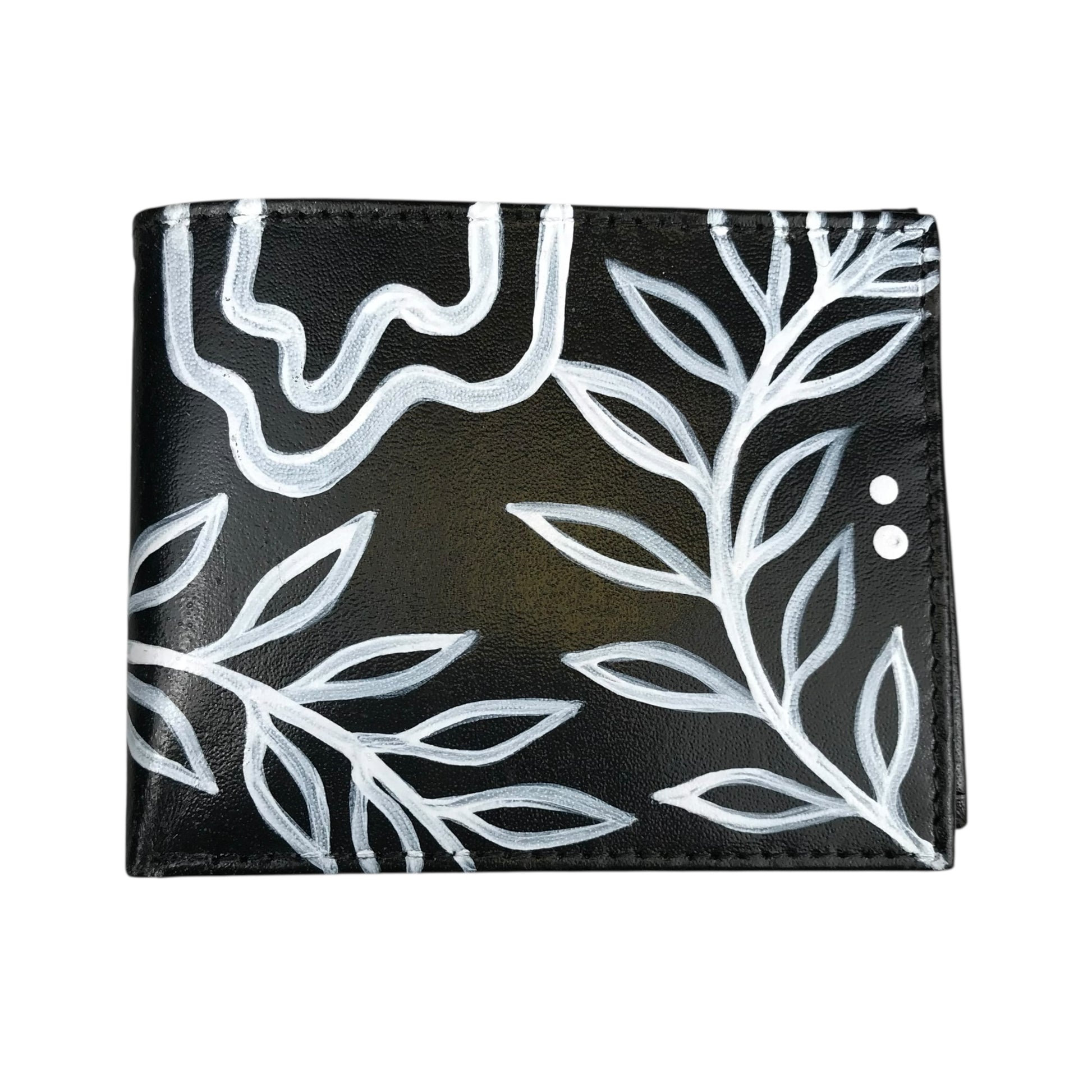 A black leather wallet hand-painted in soft white strokes flowing lines that mimic the way roots move through soil. Each piece is an up-cycled original, turning everyday carry into a small work of art.