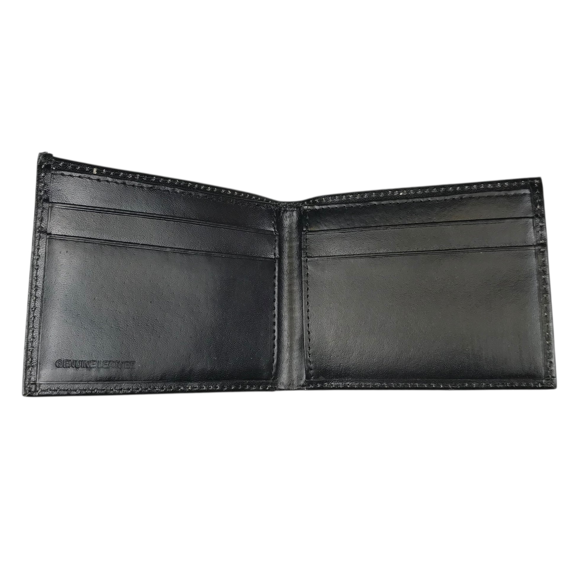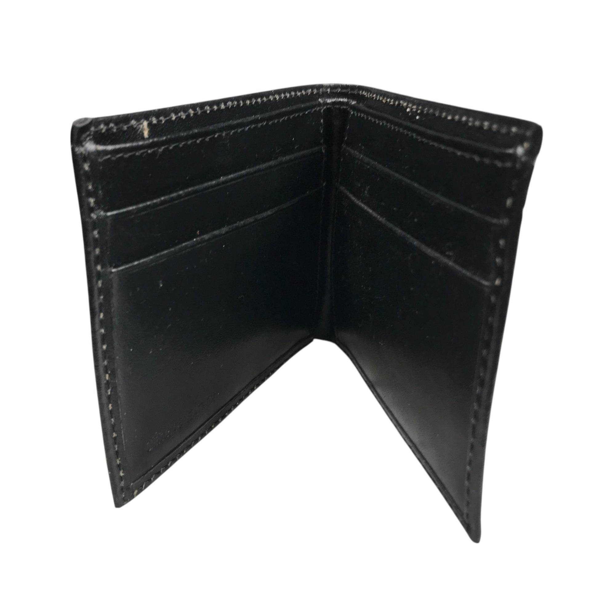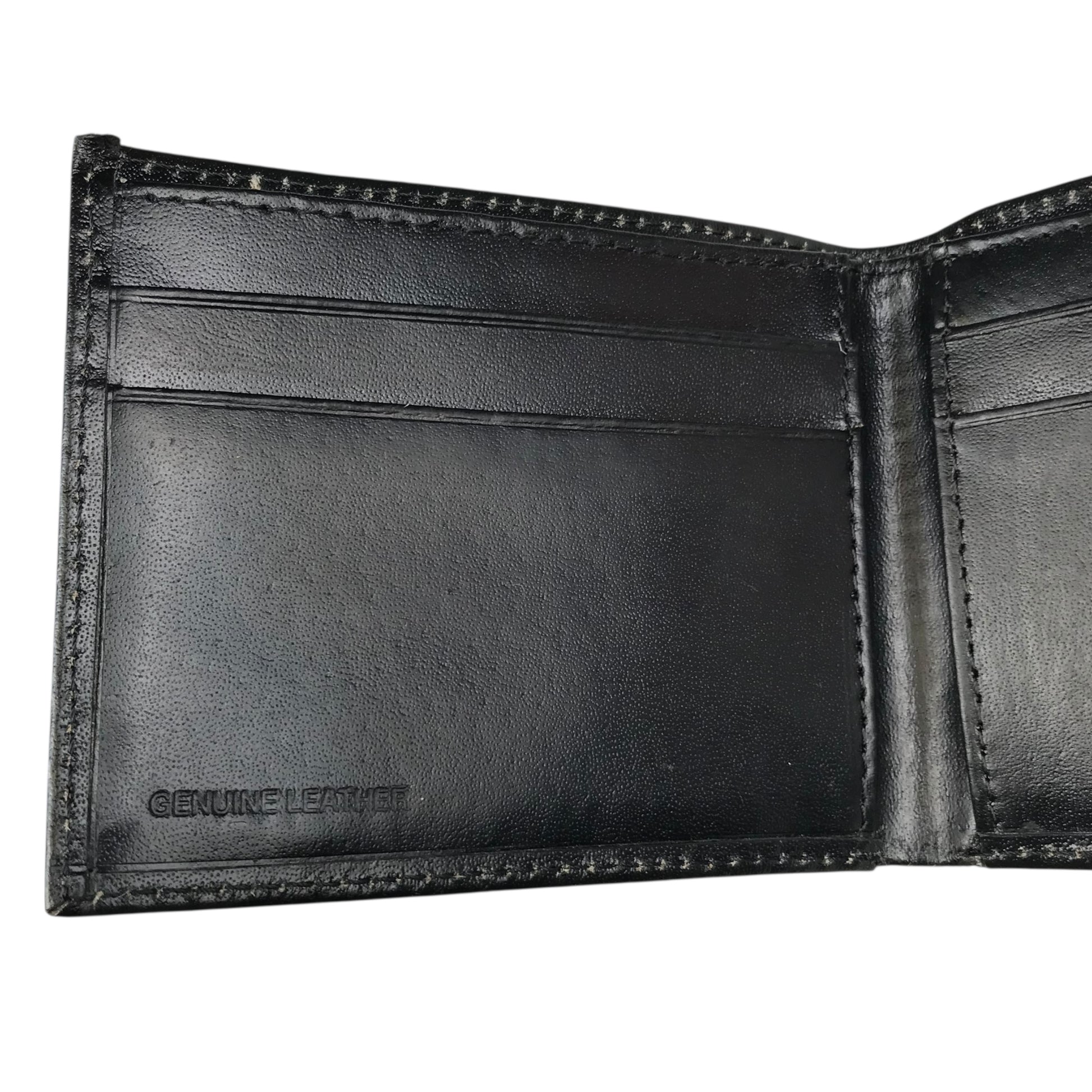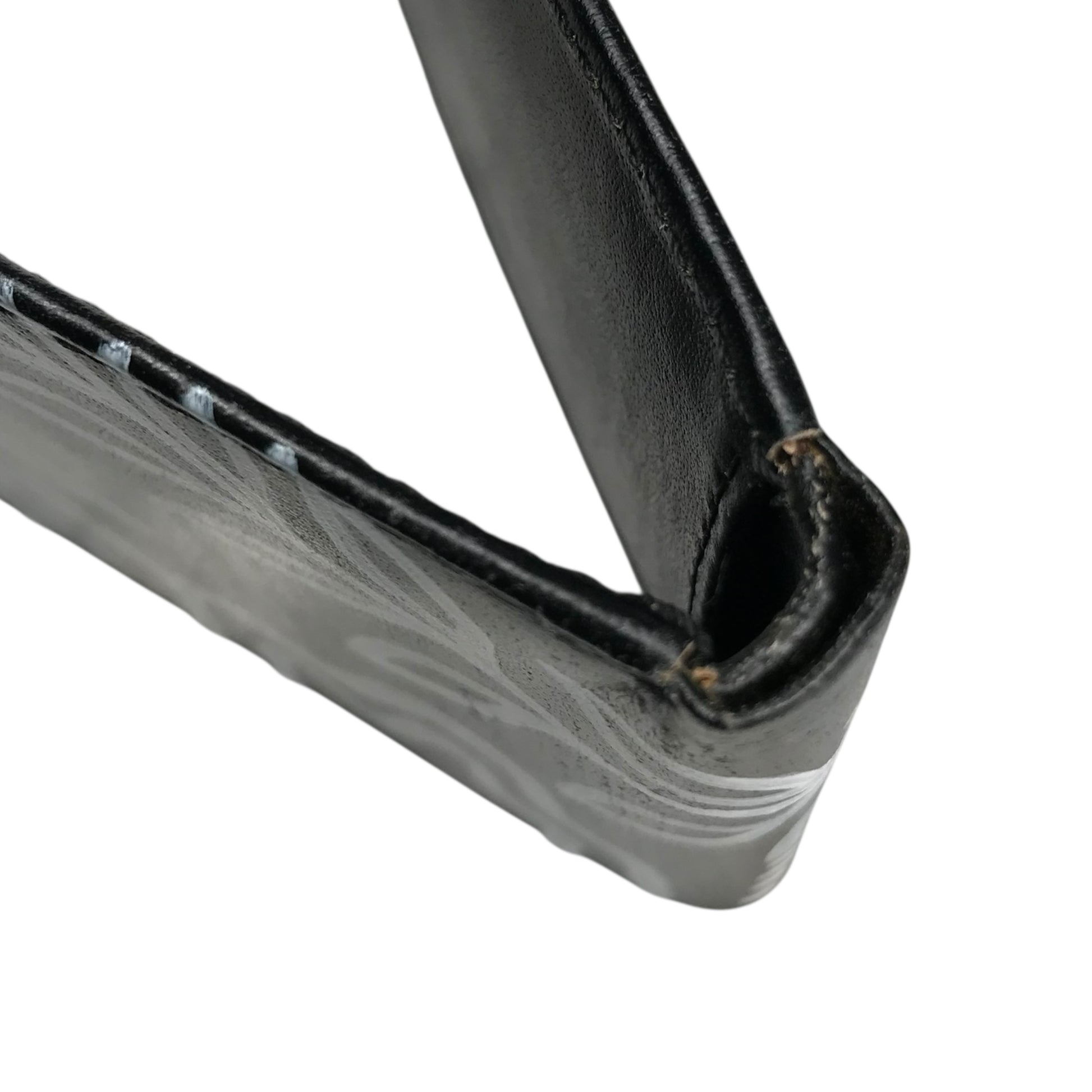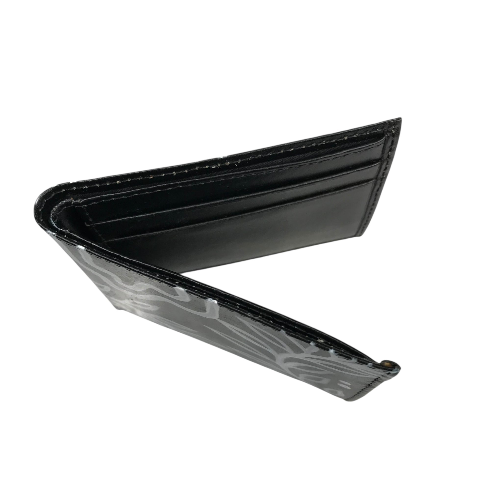 A black leather wallet hand-painted in soft white strokes flowing lines that mimic the way roots move through soil. Each piece is an up-cycled original, turning everyday carry into a small work of art.